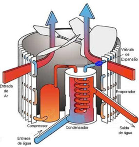 Logo depois, o fluido refrigerante é comprimido para um condensador, onde realiza a troca de calor com a água.