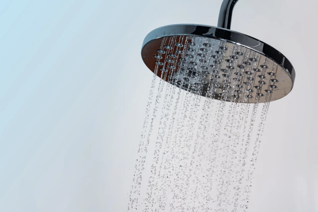 Chuveiro moderno com água fluindo em gotas claras contra fundo azul e branco